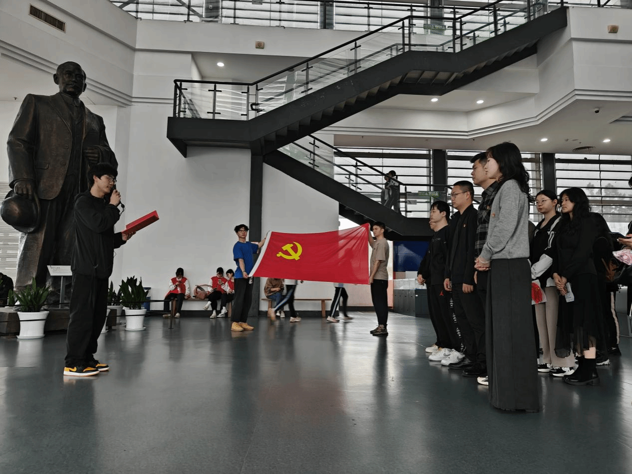 在博物馆的孙中山雕像下,团委学生会社会实践部卞宇翔向大家分享了参观感悟:“英雄傲骨立人间,铭心刻骨不敢忘。无论是老一辈先烈,还是新时代的英雄,他们的名字将永远镌刻在我们的心中,为我们指引前进的道路。他们的精神历久弥新,我们将时刻铭记,永不忘记!”在鲜红的党旗下,玉龙社区党总支书记陈子晞带领30余名党员庄重宣誓,重温入党誓词。